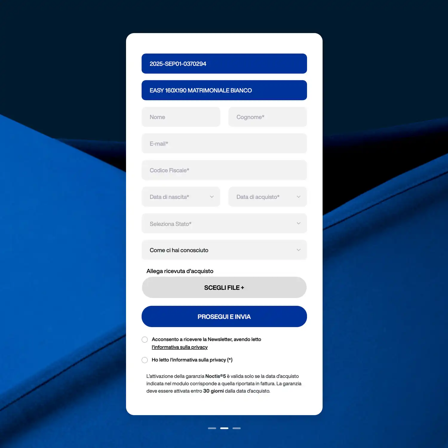 Dopo aver verificato il codice di garanzia, il passo successivo è inserire i tuoi dati personali e caricare la fattura di vendita su garanzia.noctis.it. Fallo entro 30 giorni dall’acquisto: è semplice, veloce e garantisce che il tuo prodotto sia coperto dalla garanzia Noctis fin dal primo giorno.