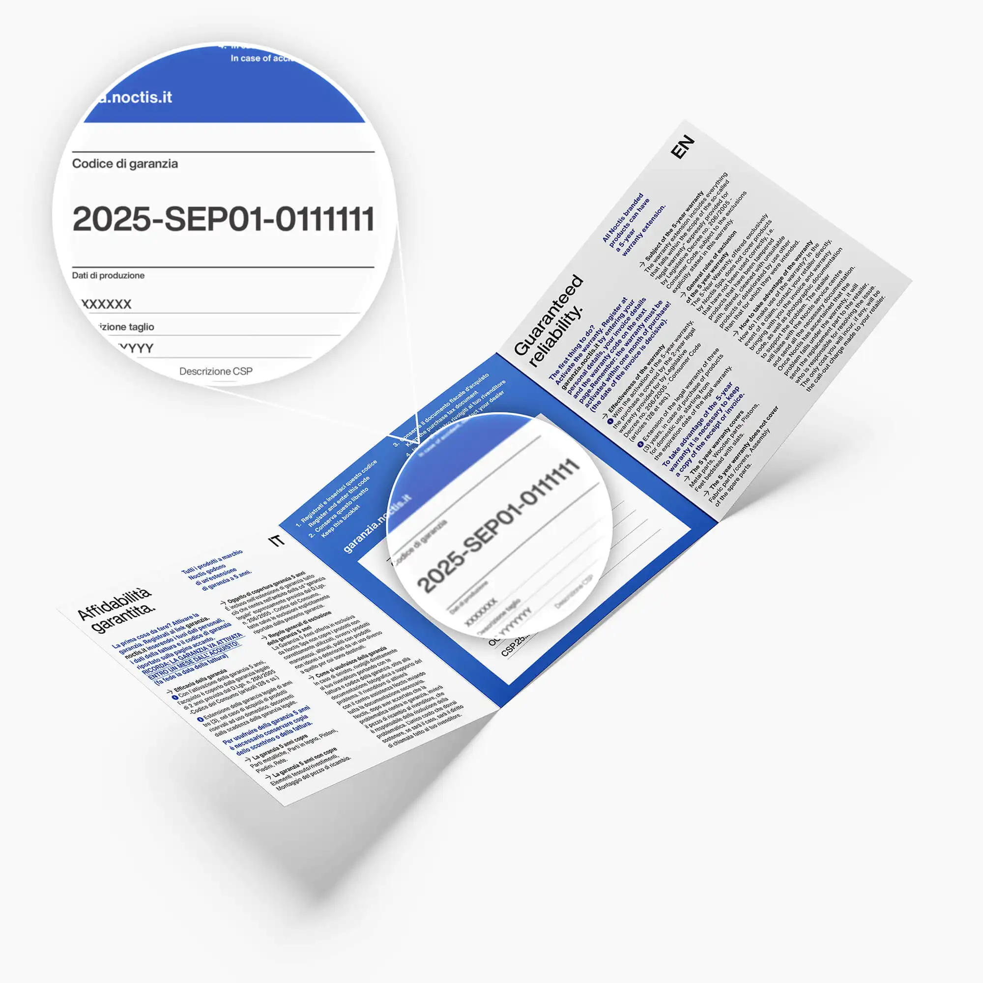 Il codice di garanzia è la tua chiave personale per attivare la copertura Noctis. Lo trovi indicato sulla pagina accanto: conservalo con cura, è unico come il tuo prodotto.